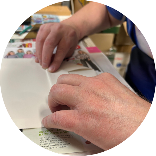 Mirek je kartonážník. Po onemocnění boreliozou oslepl na jedno oko a na druhé je silně slabozraký. Ze své původní profese se tak díky tomuto náhlému omezení musel rekvalifikovat na pro něj zcela nový pracovní obor. Mirek v dílně vyrábí šperkovnice, krabičky, obaly a embosovaná přání.